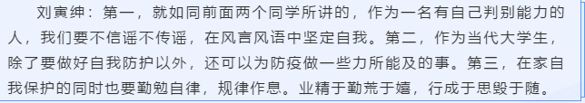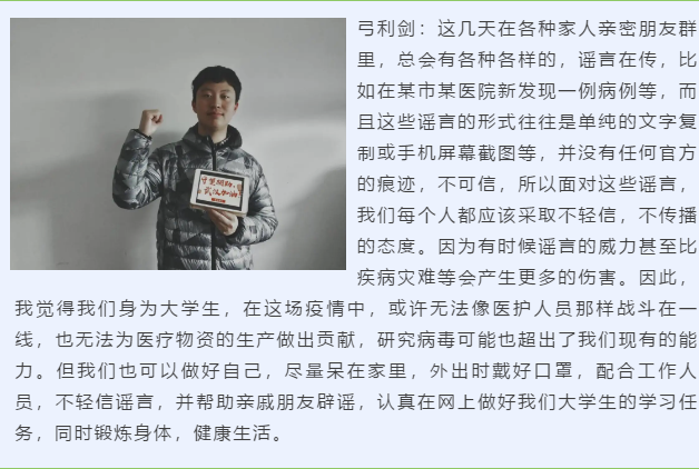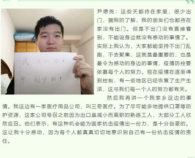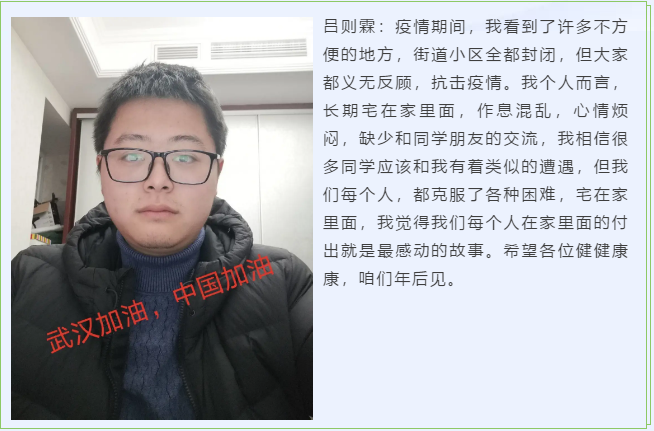 正如吕则霖同学所说,我们或许不能在一线为抗疫做出直接的贡献,但是我们在家里隔离防护,就是最好的付出。希望所有人都能健健康康,平安顺遂。