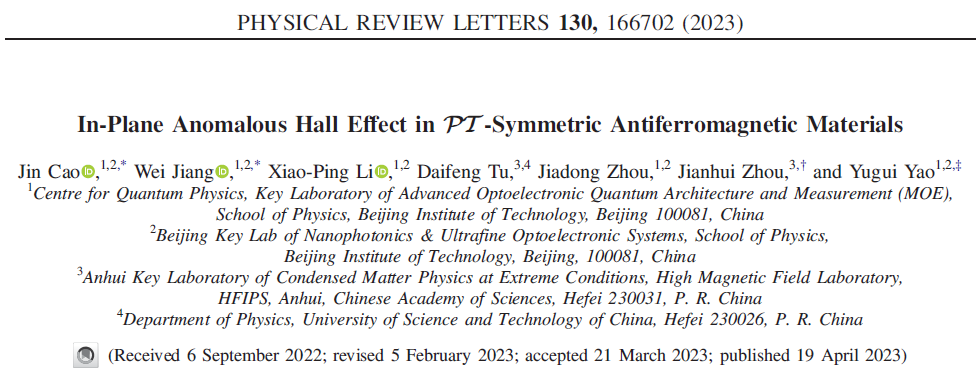 The anomalous Hall effect (AHE), a protocol of various low-power dissipation quantum phenomena and a fundamental precursor of intriguing topological phases of matter, is usually observed in ferromagnetic materials with an orthogonal configuration between the electric field, magnetization, and the Hall current. Here, based on the symmetry analysis, we find an unconventional AHE induced by the in-plane magnetic field (IPAHE) via the spin-canting effect in PT-symmetric antiferromagnetic (AFM) systems, featuring a linear dependence of magnetic field and 2π angle periodicity with a comparable magnitude to conventional AHE. We demonstrate the key findings in the known AFM Dirac semimetal CuMnAs and a new kind of AFM heterodimensional VS2−VS superlattice with a nodal-line Fermi surface and, also, briefly discuss the experimental detection. Our Letter provides an efficient pathway for searching and/or designing realistic materials for a novel IPAHE that could greatly facilitate their application in AFM spintronic devices. National Science Foundation