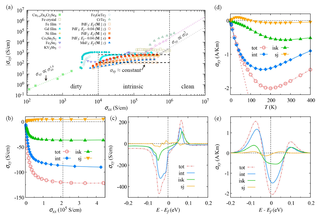 FIG. 2. Large spin-pure AHC and ANC. (a) AHC xy versus xx for PdF3. (b), (c) Disorder-related contributions to the AHC as a function of xx and energy, respectively. (d), (e) Disorder-related contributions to the ANC for various temperatures and energy.