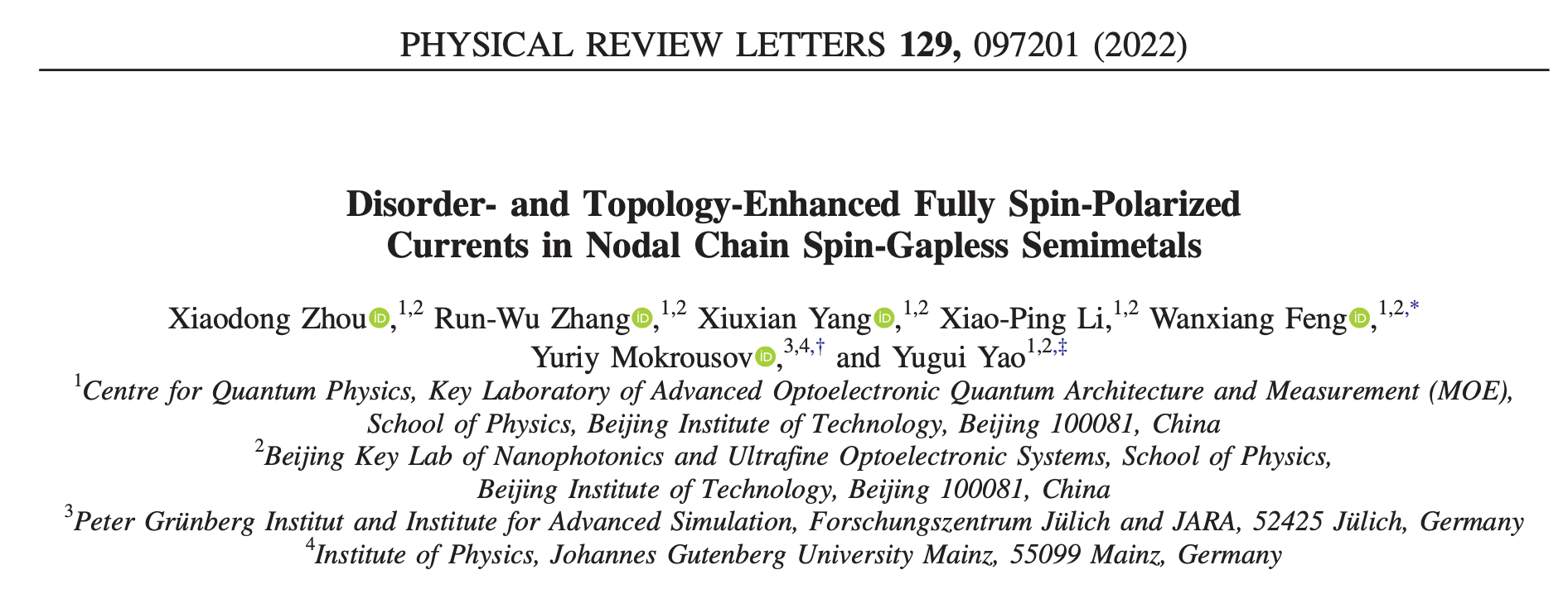 Xiaodong Zhou, Run-Wu Zhang, Xiuxian Yang, Xiao-Ping Li, Wanxiang Feng*, Yuriy Mokrousov*, and Yugui Yao*, “Disorder- and Topology-Enhanced Fully Spin-Polarized Currents in Nodal Chain Spin-Gapless Semimetals”, Phys. Rev. Lett. 129, 097201 (2022). (*Corresponding authors)