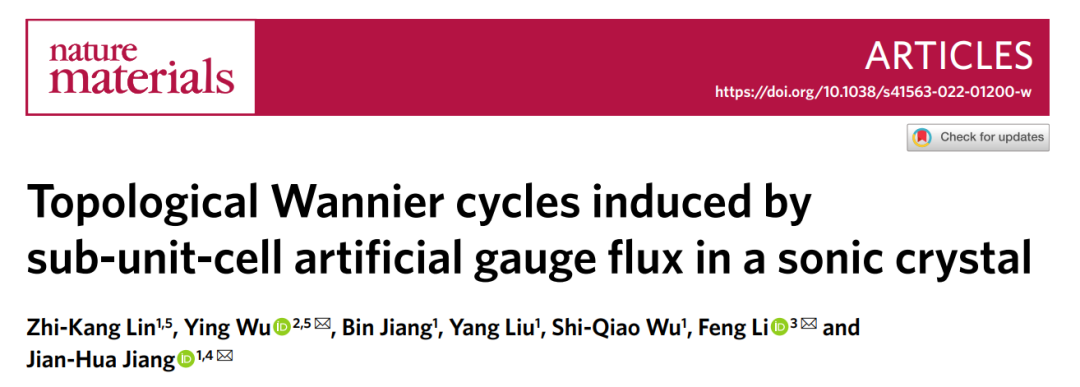 来源: 作者: 发布时间:2022-10-14On March 22, 2022, the team of Prof. Jianhua Jiang from Soochow University, together with Prof. Feng Li from Beijing Institute of Technology and Dr. Wu Ying from South China University of Technology, published a paper entitled Tolological Wannier Cycles induced by sub-unit-cell Artificial Gauge Flux in a Sonic Crystal in Nature Materials.