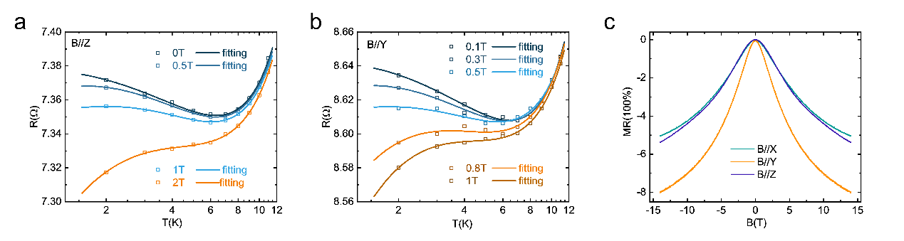The Junxi Duan and Yugui Yao's team in BIT has been steadfastly committed to investigating the transport properties of novel topological and quantum materials. To realize the heterodimensional Kondo superlattice, the research team used VS2-VS heterodimensional superlattice as the representative system, which was first synthesized by Jiadong Zhou [Nature 609, 46–51 (2022)]. In the study, the team discovered: (1) The VS2-VS heterodimensional superlattice exhibited the low-temperature resistance upturn and the negative magnetoresistance (NMR), which are typical characteristics of the Kondo effect. Interestingly, the dependence of these two phenomena on the magnetic field showed strong anisotropy, as illustrated in Figure 1. (2) With a circular disc device, the anisotropic NMR is determined to originate from the anisotropic splitting of the Kondo resonance induced by magnetic anisotropy, as shown in Figure 2. (3) By extracting the Landé factor and Curie temperature, and combining with the first-principles calculations, the unique anisotropy Kondo effect is determined to originate from the magnetic anisotropy which has the root in the unique 1D chains in the structure, as depicted in Figure 3.