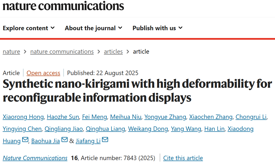 Xiaorong Hong#, Haozhe Sun#, Fei Meng#, Meihua Niu, Yongyue Zhang, Xiaochen Zhang, Chongrui Li, Yingying Chen, Qingliang Jiao, Qinghua Liang, Weikang Dong, Yang Wang, Han Lin, Xiaodong Huang*, Baohua Jia*, Jiafang Li*, “Synthetic nano-kirigami with high deformability for reconfigurable information displays”, Nat. Commun.16, 7843 (2025).