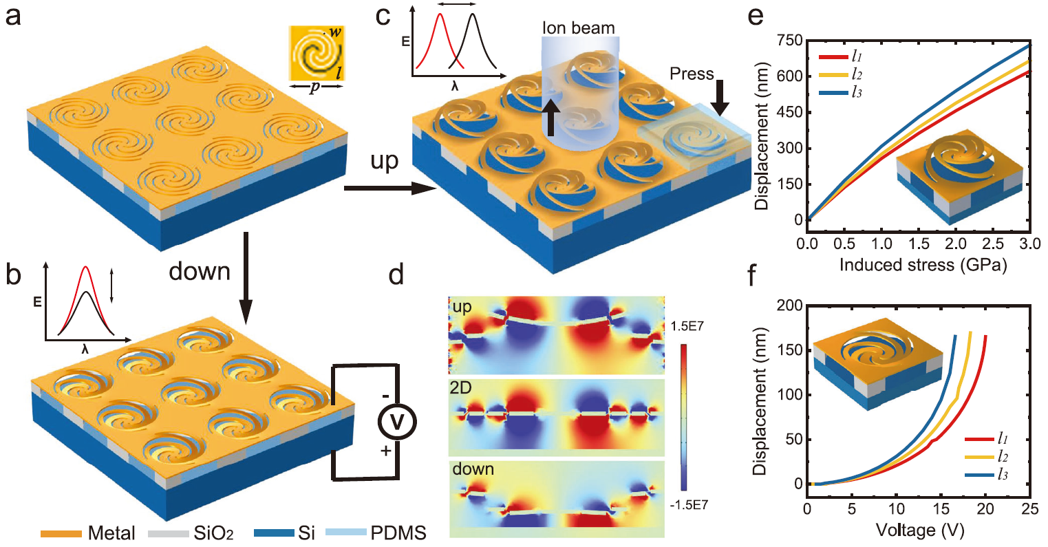 在本工作中,研究团队探究了螺旋线型、风车线型等剪纸结构在静电力场、机械应力场等的作用下的三维力学形变特征,并观察其在中红外波段的动态光谱响应特性。如图1所示,纳米剪纸阵列构建在金属/氧化硅/硅衬底上。研究人员在金属膜上像剪纸一样刻蚀精心设计的曲线,然后对底部氧化硅进行选择性湿法蚀刻,从而获得悬空的二维剪纸结构。制备的二维平面结构可以在两个方向上“折叠”,即向上和向下。向下的形变模式可以由静电力引起,向上的变形可以通过离子束的全局辐照来实现,并可以后续通过向下施加压应力实现结构的动态回复调制。超表面的热发射率调制主要通过金属狭缝的动态等离激元共振模式进行,通过外界物理场可以实现剪纸结构强烈的变形和扭曲,而这些形变引起的线状狭缝的尺寸变化,能够在中红外波段产生显著的等离激元光学调制效果。