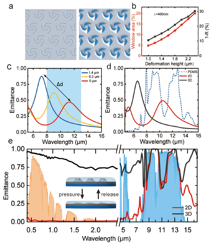 纳米剪纸热辐射器件还可以动态控制热辐射的波长范围和可见光的透射/吸收,从而实现高效的热管理。为了证明这种能力,研究团队设计了一种聚合物嵌合的具有风车形状的纳米剪纸热管理器件(图3)。风车结构可以在应力引导下实现大的扭转变形。一方面,在可见波段,它可以像窗口一样动态反射或接收太阳能。随着变形高度的增加,纳米窗口打开,窗口面积继续增加,导致可见光透射和吸收增加。通过在底部设计掺杂的硅或其他吸收材料,该装置可以有效地控制太阳能的吸收。另一方面,在红外波段,风车结构可以调节热辐射的峰值波长。图3中显示了具有不同变形高度的风车结构的热发射光谱。当二维状态下可以使纳米结构的发射峰位于大气窗口的波长范围内,而三维状态下使发射波长在大气窗口之外,这种动态的调控是通过将剪纸结构内嵌进弹性聚合物中实现的。