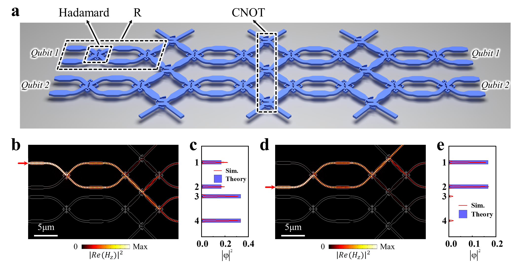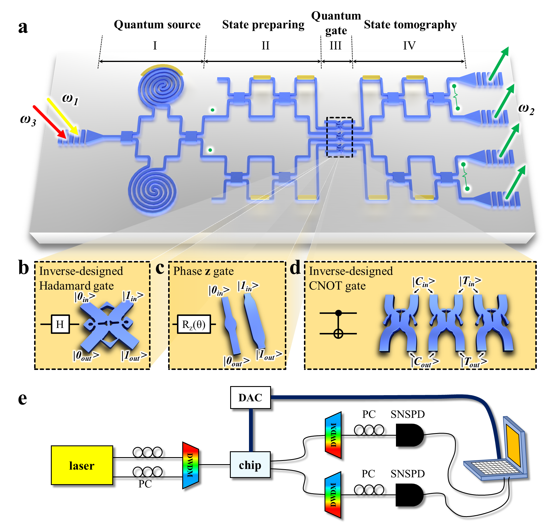 本工作中,研究人员使用反设计方法在源集成的硅光子芯片上设计并制备出了超紧凑的通用量子逻辑门(依托天津华慧芯科技高端光电子研发工艺代工平台)。进一步,通过级联多个CNOT门和单比特量子门,研究人员也讨论了任意光量子回路的进一步扩展方法。