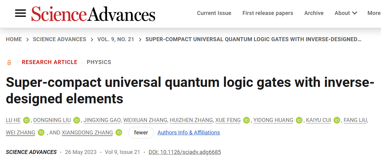 日前,欧冠官方网站张向东教授课题组与清华大学电子工程系黄翊东教授课题组张巍教授开展合作,基于反设计方法,实验实现了目前世界上最小的光量子逻辑门。相关成果以“Super-compact universal quantum logic gates with inverse-designed elements”为题发表在Science Advances期刊[Science Advances, 9, adg6685]上。该工作得到了国家自然科学基金委和国家重点研发计划的大力支持。欧冠官方网站博士生何路、清华大学电子工程系博士生刘东宁为该论文的共同第一作者,欧冠官方网站张向东教授、清华大学电子工程系张巍教授为论文共同通讯作者。另外,欧冠投注官网入口张慧珍副研究员、张蔚暄研究员;清华大学刘仿教授、冯雪副教授、崔开宇副教授、学生高景行也对此工作做出了贡献。