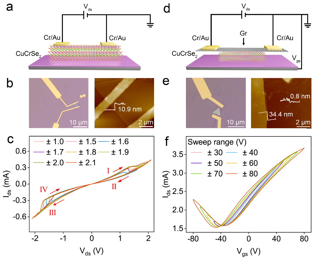 本文制做了水平和垂直器件,用于验证CuCrSe2的存储应用。在不施加栅压的情况下,水平切换源漏电流,获得了不同最大扫描电压下的Ids-Vds曲线 (图5c)。显然,从1.6V开始,Ids-Vds曲线出现了迟滞回线,表明在1.6V附近有两个临界电压对应于IP铁电极化反转。当施加正电压从0到2.1V时,器件进入低阻态(LRS),这源于之前负电压导致的负极化(过程I)。当电压达到临界电压时,负极化状态转变为正极化状态。减小的电流表明器件进入高阻态(HRS)。当电压从2.1V扫描到0V时,由于正极化平行于外部电场,器件保持在HRS(过程II)。当施加负电压从0到2.1V时,正极化状态开始切换到负极化状态(过程III)。当负电压降至1.8V时电流减小,表明该器件进入到LRS。该状态转变的延迟是由于极化反转的缓慢过程。随后,当负电压从~1.6V降至0V时,器件保持在LRS(过程IV)。高低阻态可根据外加电场的反转而切换,证明二维CuCrSe2中存在面内铁电性。随后,通过石墨烯(Gr)置于顶部用作载流子传输通道,与CuCrSe2堆叠制做成Gr/CuCrSe2垂直器件以实现OOP铁电开关(图5d)。在垂直器件中,观察到周期性的Ids-Vgs迟滞回线和明显的Dirac电压偏移,这是由于CuCrSe2纳米片中OOP铁电极化切换和从CuCrSe2到石墨烯的电荷转移。综上所述,外加电场可调控IP和OOP铁电极化切换。