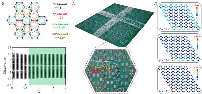 图3. (a)理论模型和计算结果;(b)安德森电路实验样品图;(c)次紧邻耦合相位引起的零维角态实验测量结果。