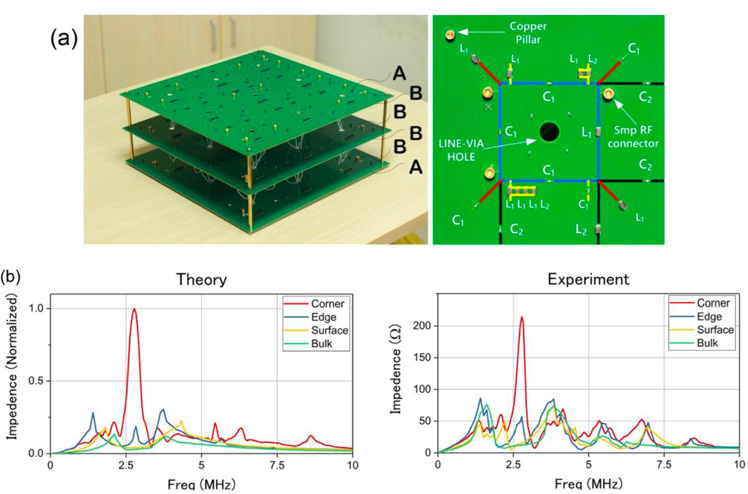 通过构造x, y, z三个方向的非互易反演对称性,由体八极子诱导的三维八极拓扑相可以产生,该三维八极拓扑相支持拓扑保护的零维角态。实现三维八极拓扑相的经典类比需要在实空间构造正和负的格点耦合,该苛刻的要求很容易通过电路网格节点间电容和电感的连接来实现。进而,通过设计三维电路节点的连接和接地,由基尔霍夫方程导出的电路导纳矩阵具有和支持体八极子紧束缚哈密顿量相同的形式。因此,所设计的经典电路可以展现八极子拓扑绝缘体的新奇性质。图1a显示了加工的电路样品图和其局域放大图。通过测量电路角落节点的阻抗响应,能隙中的高阶拓扑角态可以被验证。理论模拟和实验测量结果显示在图1b中。