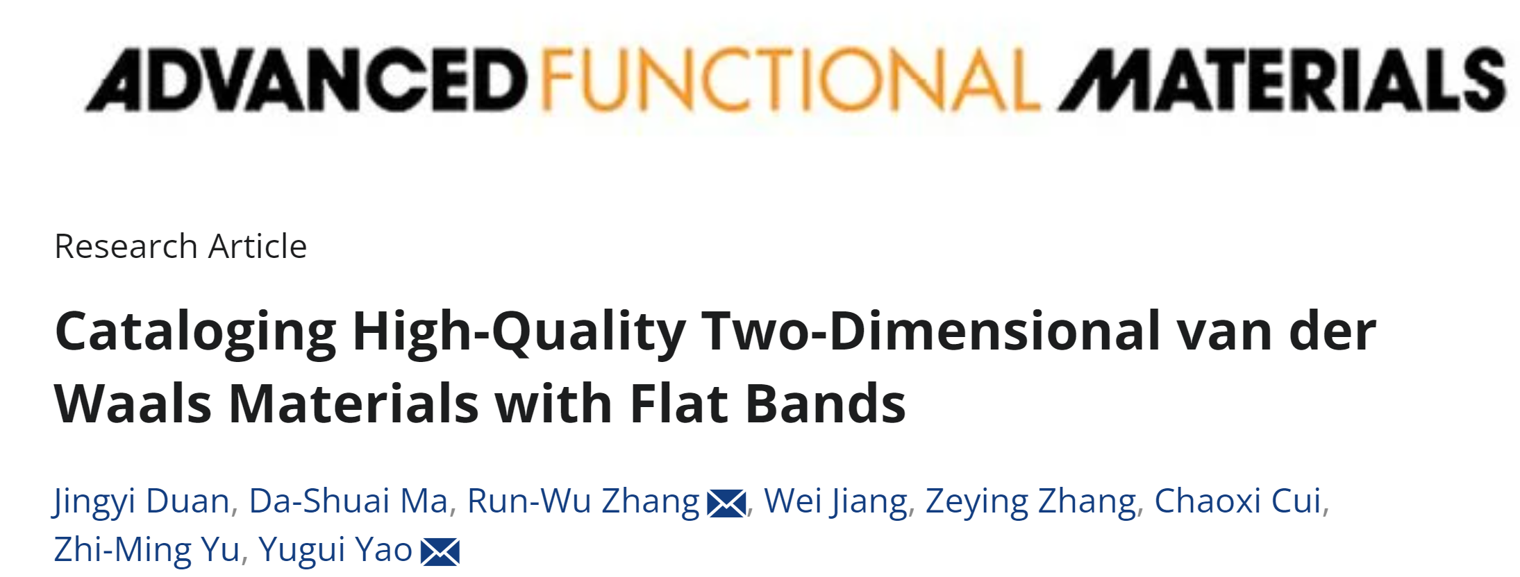 该工作得到国家自然科学基金委、科技部、欧冠投注官网入口青年教师学术启动计划等单位的支持。欧冠官方网站博士生段璟奕、马大帅博士(2021届博士毕业生,现供职于重庆大学)为该工作的共同第一作者,张闰午副教授、姚裕贵教授为共同通讯作者。另外,欧冠投注官网入口余智明教授、蒋伟教授、张泽英副教授(2019届博士毕业生,现供职于北京化工大学)、博士生崔朝喜也对此工作做出了贡献。相关结果发表于国际顶级期刊Advanced Functional Materials (IF: 19.0):Jingyi Duan,† Da-Shuai Ma,† Run-Wu Zhang*, Wei Jiang, Zeying Zhang, Chaoxi Cui, Zhi-Ming Yu, and Yugui Yao*; “Cataloging High-Quality Two-Dimensional van der Waals Materials with Flat Bands”, Advanced Functional Materials, 2313067 (2024). (†为共同一作;*为共同通讯作者。)