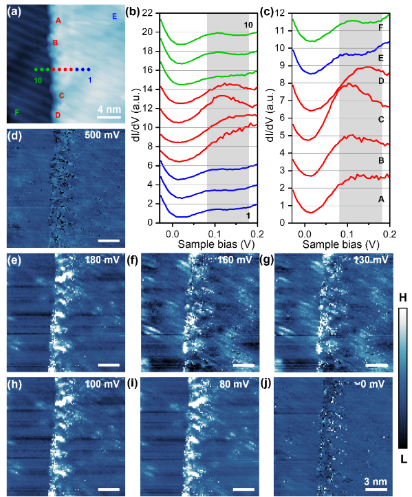 图1. 在单层Ta2NiSe7的不规则边缘采集的dI/dV谱和dI/dV maps