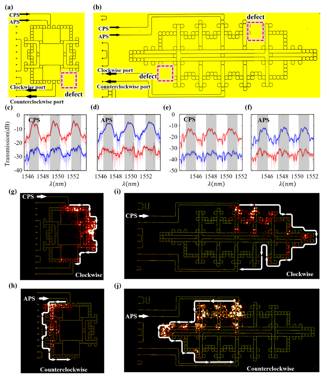 为了研究双曲光拓扑绝缘体的鲁棒性,研究人员分别在面心和体心双曲光拓扑结构的边界处引入缺陷(红色虚线框),如图5a和5b所示。随后,研究人员测量了缺陷双曲光拓扑结构的透射谱和近场分布。面心和体心双曲结构的透射谱分别绘制在图5c-5d和5e-5f中。拓扑频率激发下,面心和体心结构的近场分布分别显示在图5g-5h和5i-5j中。结果显示,即使引入缺陷,双曲光拓扑边界态仍然可以展现具有赝自旋选择特性的拓扑边缘单向传导。