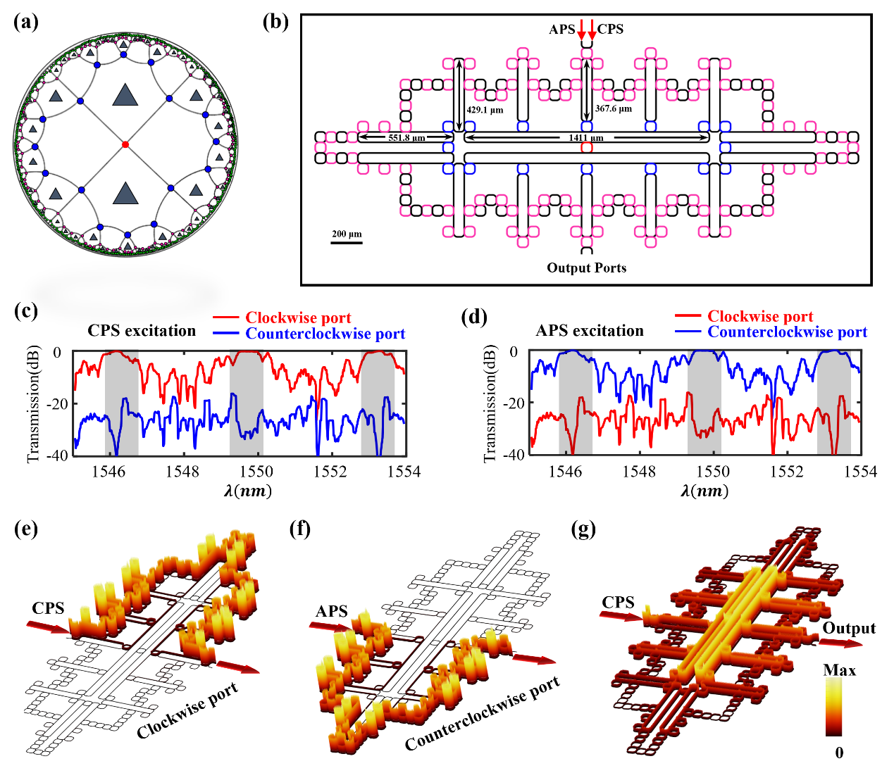 除了面心双曲光拓扑绝缘体,研究人员还设计了体心双曲光拓扑绝缘体,如图2a和2b所示。与面心双曲光拓扑绝缘体结果一致,体心双曲光拓扑绝缘体也可以展现赝自旋选择特性的拓扑边缘传导,如图2c-2g所示。