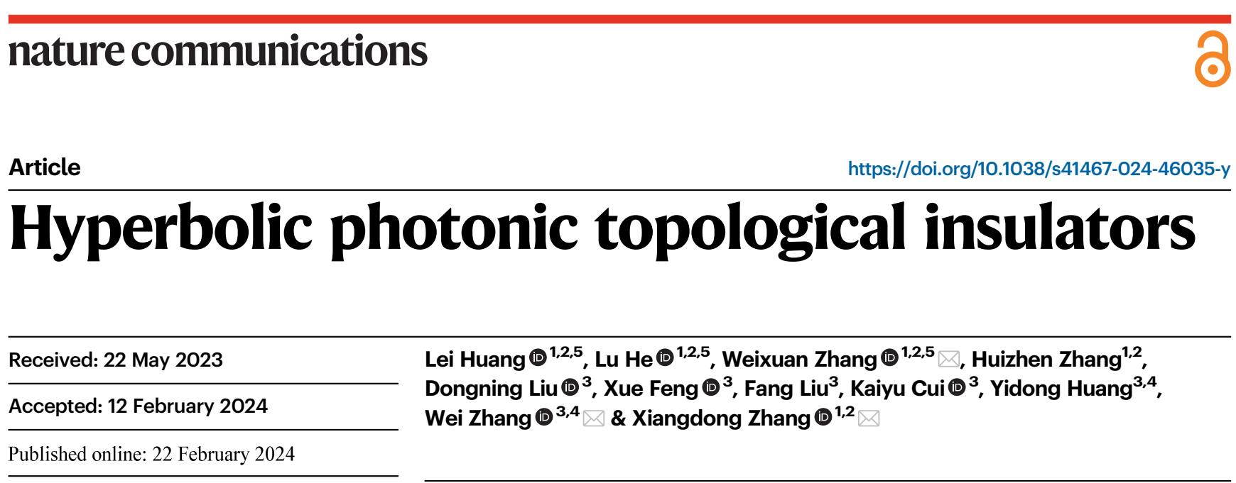 日前,欧冠官方网站张向东教授课题组与清华大学电子工程系黄翊东教授课题组合作,在双曲光拓扑绝缘体研究方面取得重要进展。相关工作发表在Nat. Commun. 15, 1647 (2024)上。研究工作得到国家重点研发计划,国家自然科学基金和中国科协青年人才托举工程的资助。欧冠官方网站博士生黄磊、何路(现为光电学院特立博士后)和张蔚暄副教授为论文共同第一作者,张向东教授、清华大学张巍教授和张蔚暄副教授为通讯作者。另外,欧冠投注官网入口张慧珍副研究员,清华大学刘仿教授、冯雪副教授、崔开宇副教授、刘东宁博士也对此工作做出了贡献。
