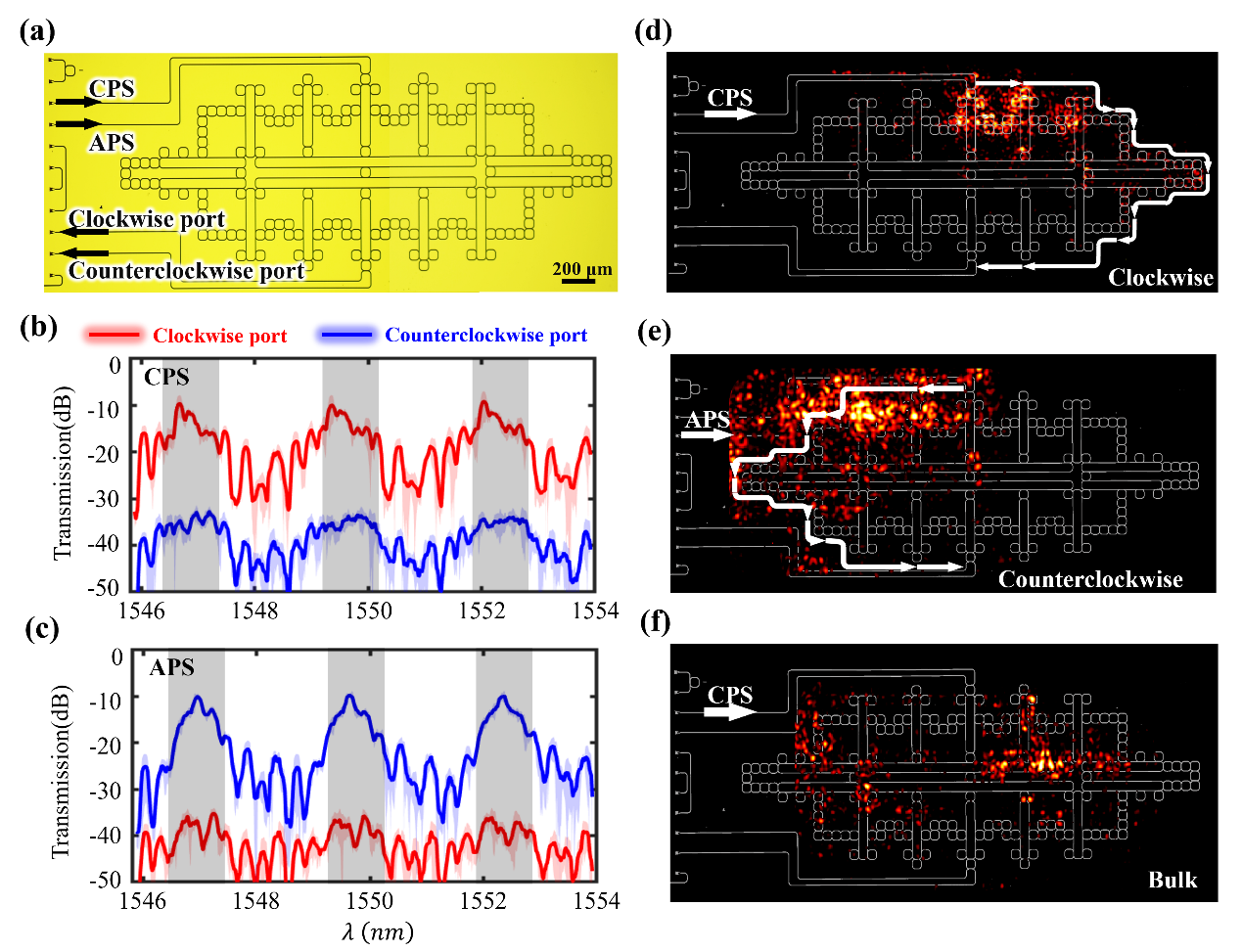 首先,研究人员考虑了庞加莱圆盘上的{6,4}面心双曲拓扑晶格模型,如图1a-1c所示。通过引入最近邻、次近邻和次次近邻格点间的复数耦合(一半原包内),可以破坏系统的时间反演对称性,从而引入非平庸的拓扑性质。图1d和1e分别显示了两种耦合相位下的能谱和实空间陈数计算结果,其中能谱格点的颜色表征相应特征态的边缘局域化强度。可以看出,在零能附近存在具有非平庸陈数的双曲边界态。随后,研究人员通过设计环形谐振腔的空间排布和耦合,理论构造了对应于{6,4}双曲拓扑晶格模型的片上光学结构,如图1f所示。图1g为双曲拓扑光学结构的局部放大示意图。进一步,研究人员利用有限元方法,对所设计的双曲拓扑光学结构进行全波模拟。图1h和1i分别显示了顺时针赝自旋(CPS)和逆时针赝自旋(APS)激发下,对应于相反传播方向输出端口的透射谱计算结果。计算结果显示,在拓扑边界态的频率范围内,CPS和 APS分别在相反传播方向的出射端口展现高透射率。而在平庸边界态和体态对应的频率范围内,展现较低透射率。图1j和1k显示了拓扑频率激发下CPS和 APS的稳态场分布结果。图1l为平庸体态频率激发的场分布结果。计算结果表明,在拓扑态频率范围激发下,输入光信号可以展现赝自旋选择特性的拓扑边缘传导特性。