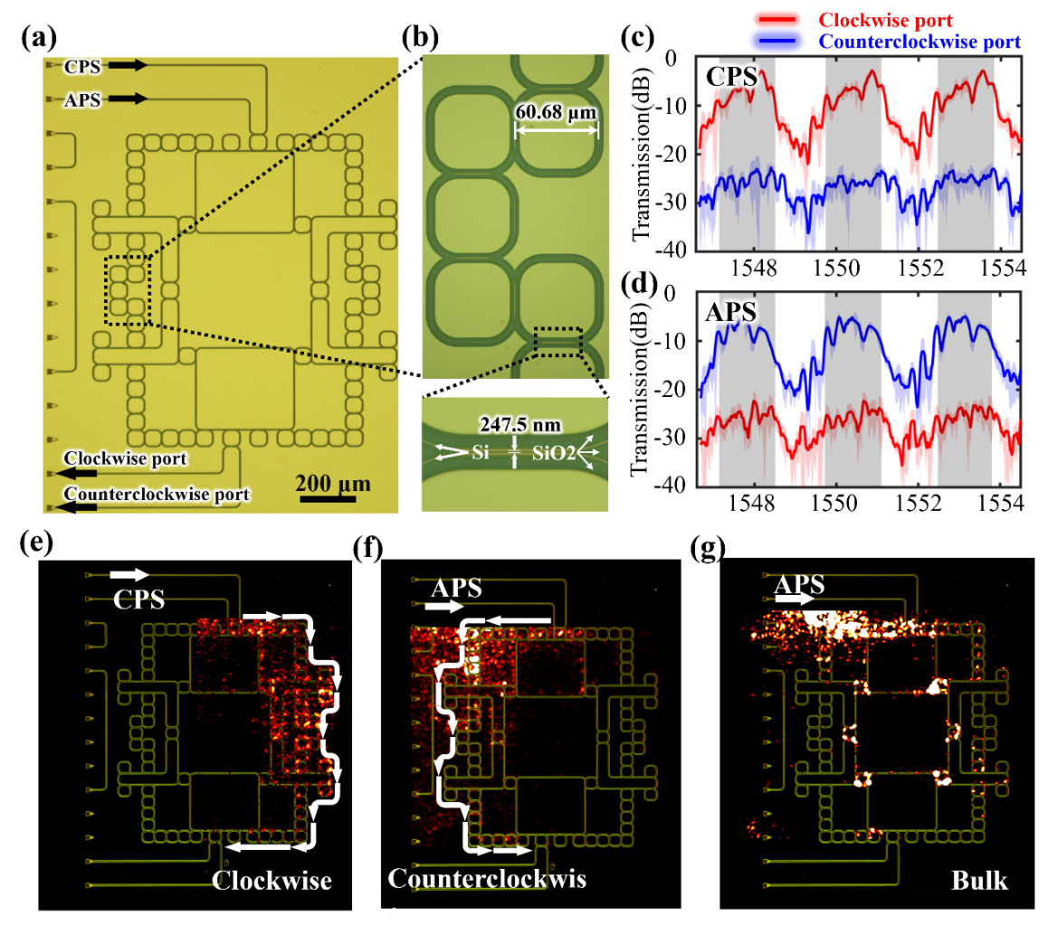 研究人员实现了对双曲光拓扑绝缘体的实验验证。图3a显示了由电子束光刻和等离子体蚀刻方法所制备面心双曲光拓扑绝缘体显微镜图像。研究人员对实验样品进行了透射谱和近场分布的测量。在透射谱测量时,研究人员分别在CPS和APS进行激发,分别测量顺时针和逆时针输出端口的信号强度,其结果分别显示在图3c和3d中。其中,两个输出端口的传输信号分别用红线和蓝线表示,阴影区域对应于测量信号的波动范围。结果表明,当以CPS(APS)入射时,在拓扑边缘态频率范围内,顺时针(逆时针)出射端口的透射率远大于逆时针(顺时针)出射端口。而当输入频率远离拓扑边缘态频率时,顺时针输出端口的透射率显著降低,对应于平庸体态的激发。图3e和3f为1550.7 nm处CPS和APS激发下的近场分布。实验结果清晰展现了赝自旋选择的拓扑边缘传输特性。进一步研究人员测量了1551.4 nm激发下的近场分布,如图3g所示。可以发现,平庸体态得到了激发。上述实验结果清楚地证明了具有赝自旋选择特性的双曲拓扑边缘态的存在。同样,研究人员也对体心双曲光拓扑绝缘体进行了实验验证,如图4所示。