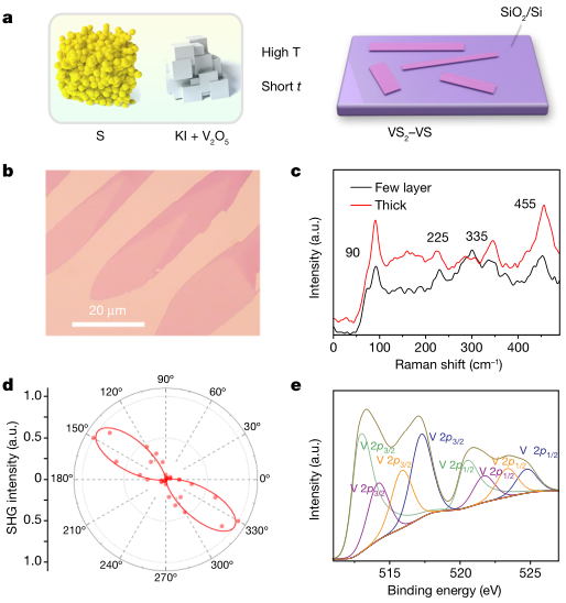图1、VS2-VS超晶格生长过程和光学图像。a, VS2-VS的生长过程。b, VS2-VS 超晶格薄片的光学图像。c,不同厚度的VS2-VS超晶格的拉曼光谱。d, VS2-VS中SHG强度随角度的变化曲线。e, VS2-VS超晶格中V 2p 的XPS光谱。