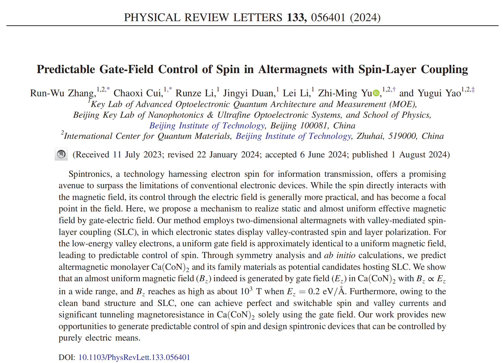 Run-Wu Zhang, Chaoxi Cui, Runze Li, Jingyi Duan, Lei Li, Zhi-Ming Yu, and Yugui Yao; “Predictable Gate-Field Control of Spin in Altermagnets with Spin-Layer Coupling”, Physical Review Letters, 133, 056401 (2024).