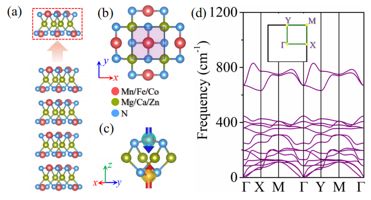图2. 九种高质量的候选材料:单层Ca(CoN)2家族。(a) 从体相中剥离候选单层的示意图;(b) 单层A(BN)2的晶体结构俯视图;(c) 单层Ca(CoN)2的空间自旋密度分布;(d) 单层Ca(CoN)2的声子谱。