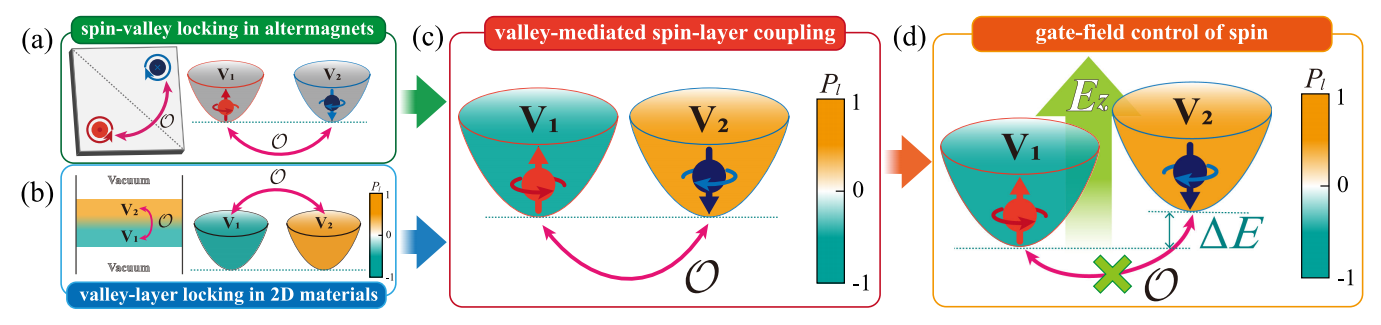 图1. 谷媒介SLC的机理及全电控自旋示意图。(a)具有两个能谷V1和V2的交错磁体材料天然被赋予自旋-谷锁定特性,其受到某一(磁性)晶体对称性(或晶体对称性与时间反演联合操作)而不是时间反演对称性的保护。(b)二维谷电子材料可能具有某一(磁性)晶体对称性(或晶体对称性与时间反演联合操作)保护的谷-层锁定,其中两个谷态具有相反的层极化。(c)二维交错磁体中谷媒介SLC可以形象的类比为自旋-谷和谷-层锁定的结合。(d)谷媒介SLC使全电控自旋成为可能。