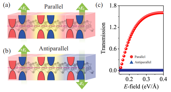 此外,团队提出的谷媒介SLC方案还可以彻底改变类隧道磁阻 (TMR) 器件的设计方式。所提出的类TMR器件不仅表现出显著增强的TMR效应,而且由单一材料构成—TMR器件中的平行和反平行配置可以通过对材料不同区域施加平行和反平行的栅极电场来实现(图4)。