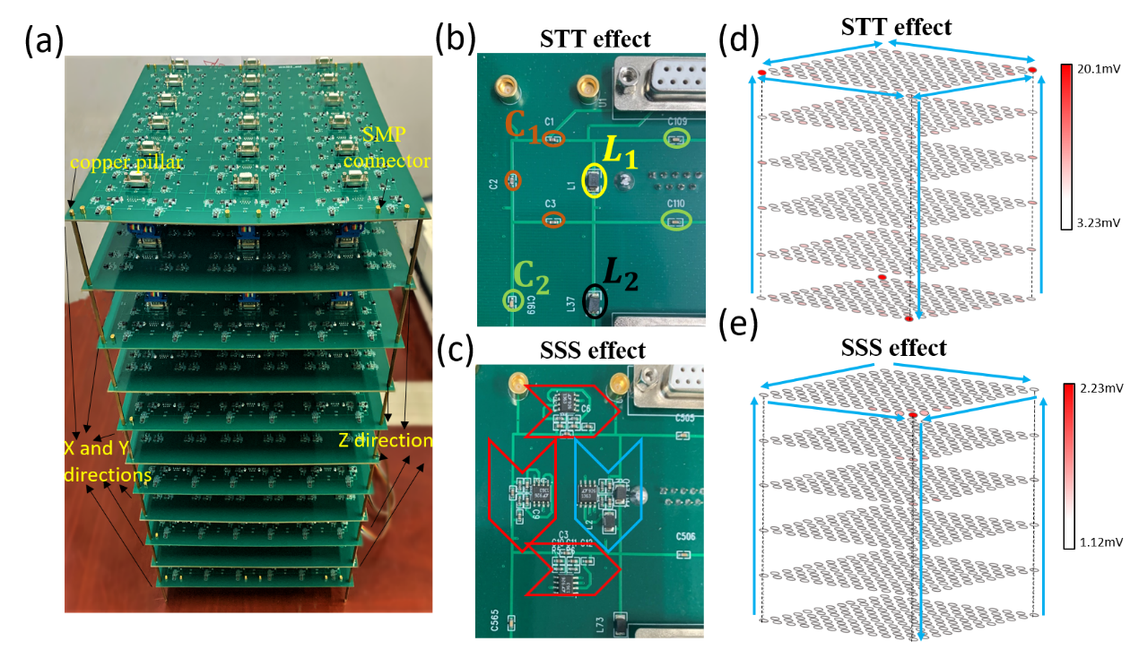 图2 (a)和(b)三维趋肤-拓扑效应实验样品图。(c)三维高阶趋肤效应实验样品图。(d) 三维趋肤-拓扑效应能量分布图。(e)三维高阶趋肤效应能量分布图。