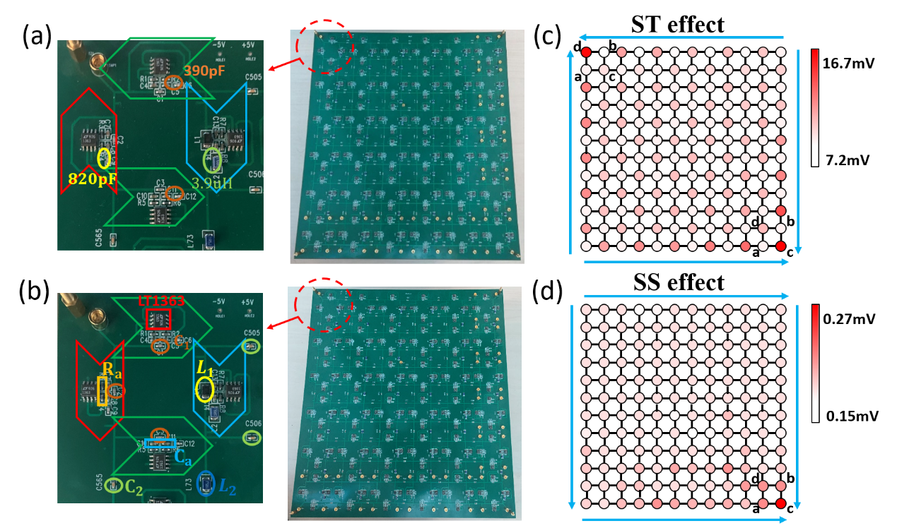 图1(a)二维趋肤-拓扑效应实验样品图。(b)二维二阶趋肤效应实验样品图。(c) 二维趋肤-拓扑效应能量分布图。(d)二维二阶趋肤效应能量分布图。