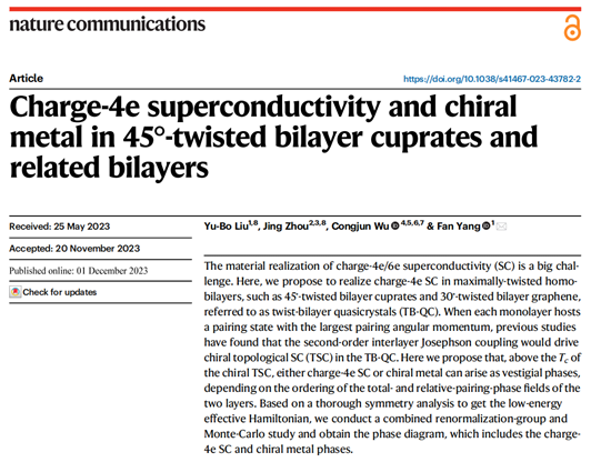 该工作相关论文“Charge-4e superconductivity and chiral metal in 45°-twisted bilayer cuprates and related bilayers”发表在Nat. Commun. 14, 7926 (2023)。欧冠官方网站杨帆教授为论文唯一通讯作者。杨帆教授指导的博士生刘玉波和重庆邮电大学周晶讲师为论文共同第一作者。参与论文工作的还有西湖大学的吴从军教授。论文受到国家自然科学基金重点、面上项目资助。