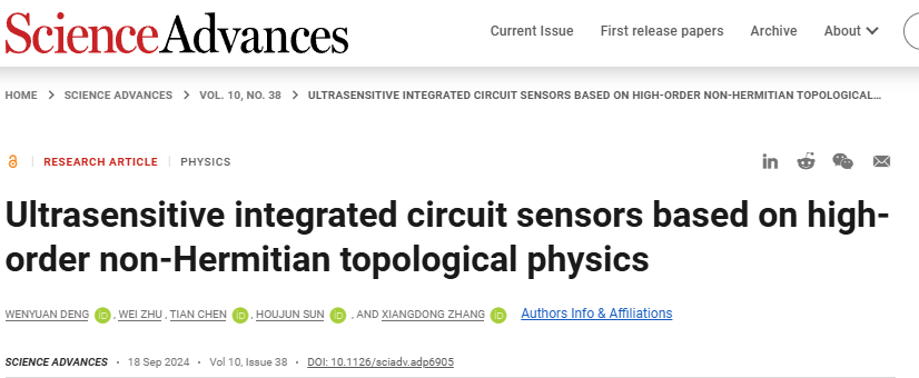 日前,欧冠官方网站张向东教授课题组和集成电路与电子学院孙厚军教授课题组合作,理论提出并实验实现了目前世界上第一个高阶拓扑传感芯片。相关成果以“Ultra-sensitive integrated circuit sensors based on high-order non-Hermitian topological physics”为题发表在Science Advances期刊上。该工作得到了国家自然科学基金委和国家重点研发计划的大力支持。欧冠官方网站博士生邓闻远、集成电路与电子学院朱伟特聘研究员为该论文的共同第一作者,欧冠官方网站张向东教授、集成电路与电子学院孙厚军教授和朱伟特聘研究员为论文共同通讯作者。另外,欧冠官方网站陈天副教授也对此工作做出了贡献。