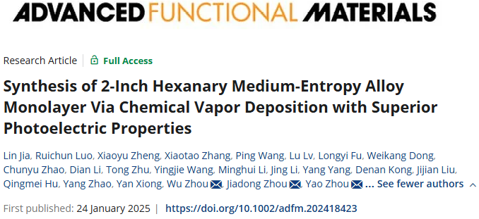 过渡金属硫族化合物(TMDs)因独特的电子和光学性质而备受关注,使其在电子学、光电子学和催化领域具有广泛的应用前景。为拓宽TMDs的应用,研究人员开发了多种方法(堆叠、扭转、合金化或相工程)以有效调控TMDs的性质。然而这些方法在单层晶体中引入元素的种类和协同效应的复杂性方面仍存在局限性。熵工程可通过引入不同元素来调控材料的物理和化学性质,这一概念起源于高熵合金,此外,熵工程能促进合金中独特晶格结构的形成,为开发高效催化剂提供了坚实的基础。目前,熵工程的报道仅限于在范德华块体,二维过渡金属硫族化合物熵工程单层材料的制备仍是一个亟待深入探索的领域。鉴于以上问题,欧冠官方网站周家东,前沿交叉学院周遥与中国科学院大学周武团队合作,通过化学气相沉积(CVD)法成功实现了2英寸1T''相六元中熵合金(ReaWbMocIndSxSey,简称ME alloy)单层的外延生长。通过X射线光电子能谱、扫描透射电子显微镜、能量色散X射线光谱和电子能量损失谱等表征手段证实了六种元素在中熵合金单层中的均匀分布。该六元中熵合金光电探测器可实现从可见光到近红外波段的超宽光谱响应,其在520 nm波长激光下的最大响应度可达100.2 A W⁻1,过电位和和塔菲尔斜率分别为43.7 mV和51.9 mV dec⁻¹。该工作为设计混合熵合金开辟了新途径,为TMDs在光增强电催化析氢领域中的应用提供了可能。相关成果以 “Synthesis of 2-inch Hexanary Medium-Entropy Alloy Monolayer Via Chemical Vapor Deposition with Superior Photoelectric Properties”于 1月24日发表于学术期刊《Advanced Functional Materials》。