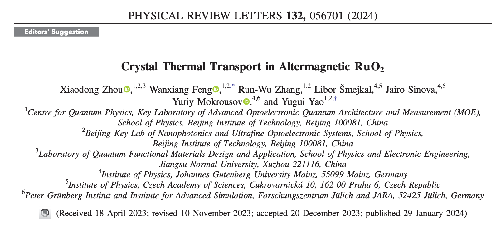文章信息(*为通讯作者):Xiaodong Zhou, Wanxiang Feng*, Run-Wu Zhang, Libor Šmejkal, Jairo Sinova, Yuriy Mokrousov, and Yugui Yao*, “Crystal Thermal Transport in Altermagnetic RuO2”, Phys. Rev. Lett. (Editors' Suggestion) 132, 056701 (2024).
