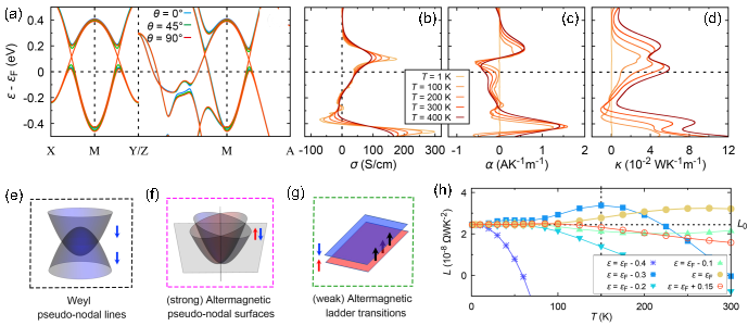 图2:(a) 交错磁体RuO2的能带结构;(b-d) RuO2的晶体霍尔电导率、晶体能斯特电导率和晶体热霍尔电导率随温度的变化;(e-g) 导致晶体热输运现象的三种物理机制:外尔赝节线、交错赝节面、交错阶梯跃迁;(h) 不同费米能级位置处反常输运洛伦兹比率随温度的变化。