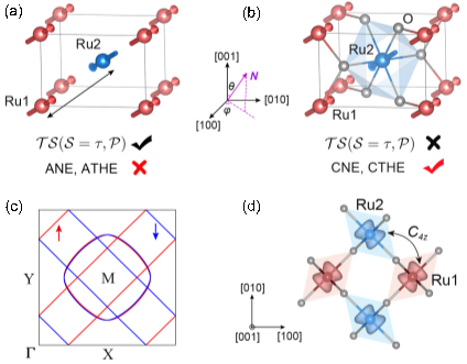 图1:(a-b) 交错磁体RuO2的晶体结构和磁结构;(c-d) 交错磁体RuO2在倒空间的自旋极化费米面和在实空间的自旋极化电荷密度。