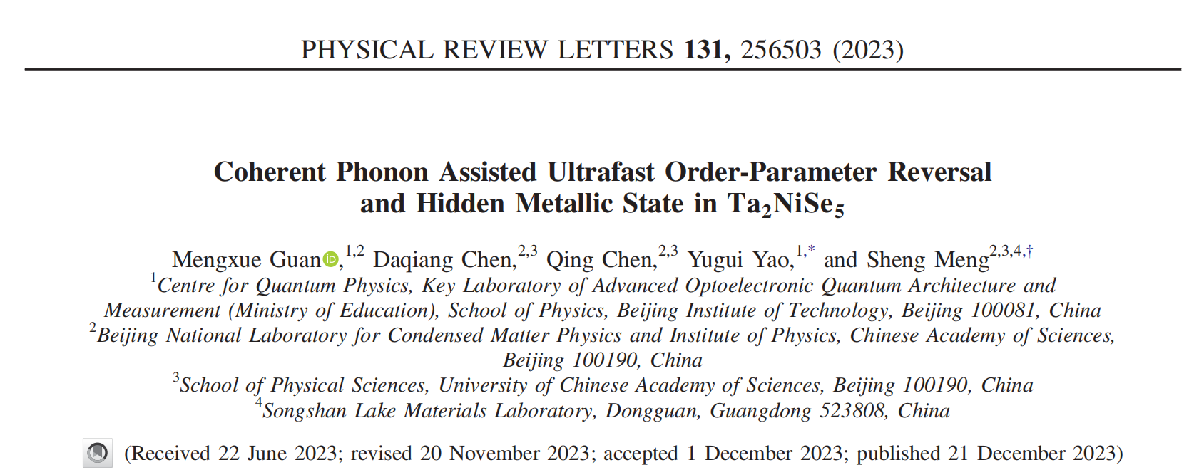 近期,欧冠官方网站姚裕贵、关梦雪特别研究员和中国科学院物理研究所的孟胜研究员团队展开合作,利用非绝热含时密度泛函分子动力学(TDDFT-MD)方法深入探究了Ta2NiSe5中的非平衡多体相互作用。研究明确了晶格序参量在光诱导绝缘体-金属转变过程中的关键作用,为理解关联量子材料中激子-声子动力学提供了全面的视角。相关研究题目为《Coherent Phonon Assisted Ultrafast Order-Parameter Reversal and Hidden Metallic State in Ta2NiSe5》,成果被发表在物理学领域的顶级期刊Physical Review Letters上。
