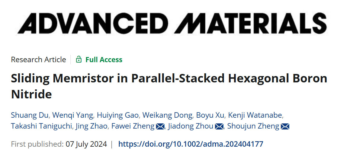 鉴于此,欧冠投注官网入口郑守君副教授、周家东教授、郑法伟教授共同合作在Advanced Materials在线发表“Sliding memristor in parallel-stacked hexagonal boron nitride”的研究成果(Adv. Mater. , 240417, (2024))。研究者通过利用石墨烯/平行堆叠六方氮化硼(PS-BN)/石墨烯隧穿器件设计了一种滑移忆阻器,它在界面极化的调制下表现出可调的忆阻行为。我们的滑移忆阻器的忆阻行为归因于带正电荷的硼离子的层间迁移、聚集和导电丝(CFs)的形成,这也得到了理论计算的支持。我们提出的基于 PS-BN 隧穿器件的滑移忆阻器,可以通过极化和施加电场成功地操纵电阻状态。滑移忆阻器稳定的记忆窗口和忆阻行为表明,可以通过隧穿电流探索滑移铁电性,并将其集成到忆阻器中。这一发现不仅为表征滑移铁电材料提供了一种新方法,还为信息存储和神经形态计算中的忆阻器应用提供了可能。