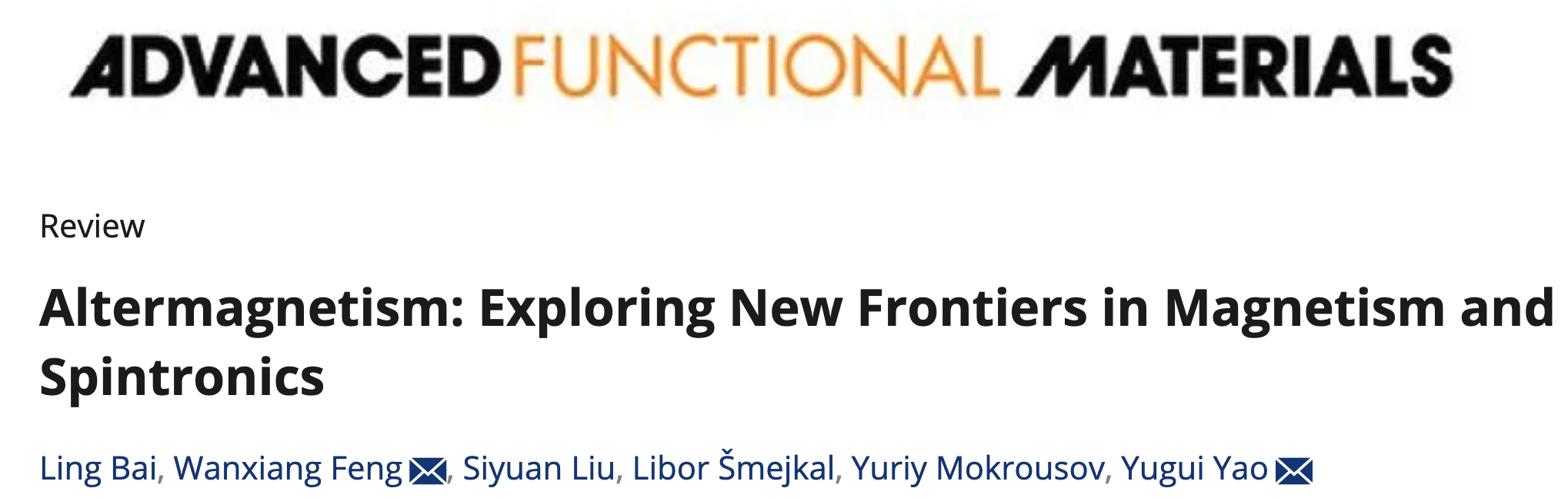 文章信息(*为通讯作者):Ling Bai, Wanxiang Feng*, Siyuan Liu, Libor Šmejkal, Yuriy Mokrousov, Yugui Yao*, “Altermagnetism: Exploring New Frontiers in Magnetism and Spintronics”, Adv. Funct. Mater. 2409327 (2024).