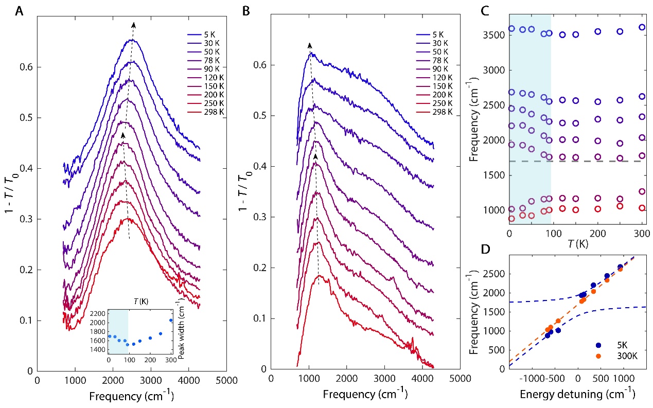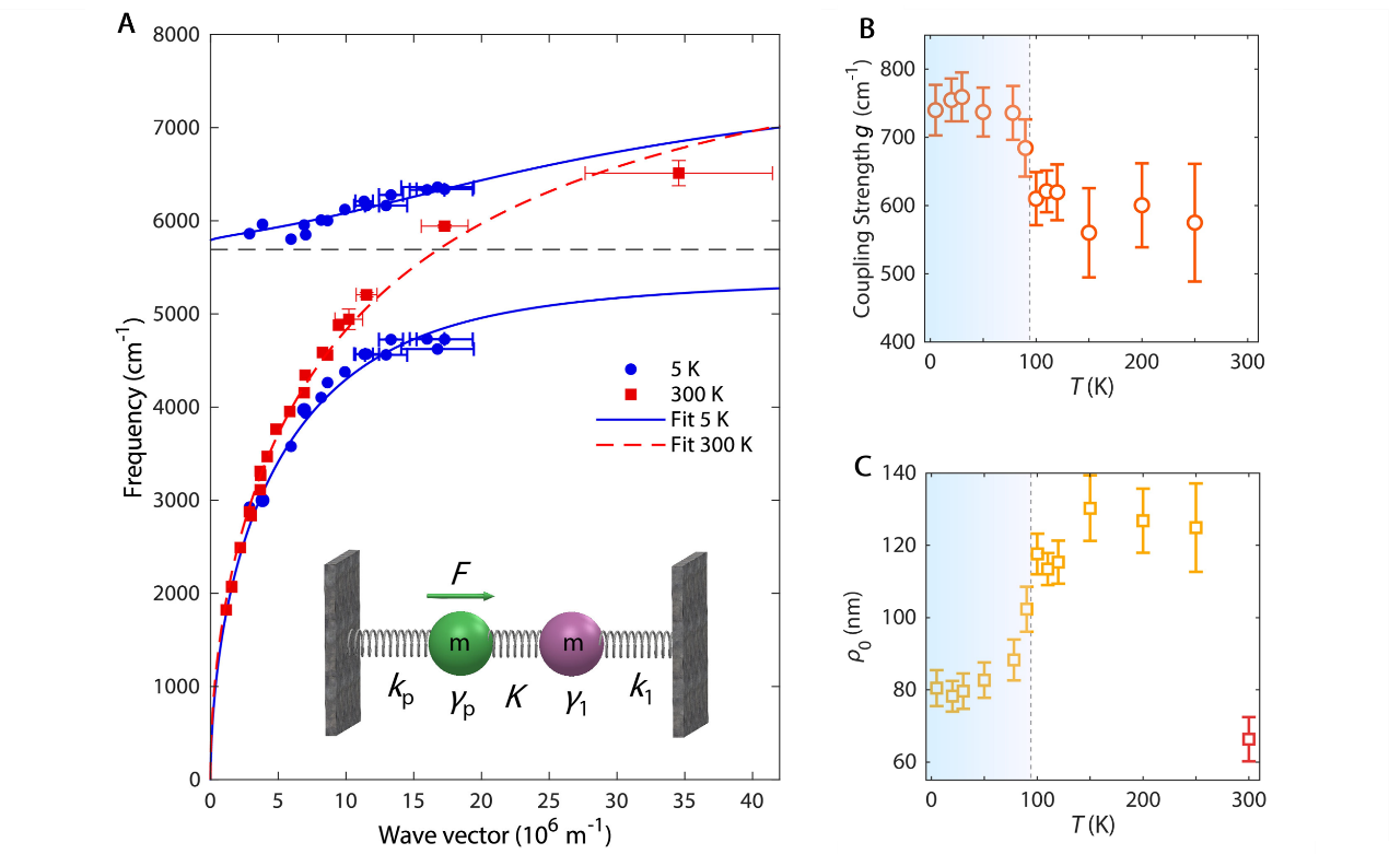 根据以上讨论启发,北理工研究团队通过对笼目金属CsV3Sb5进行机械剥离,成功制备出高质量二维薄膜,并在低温吸收光谱中观测到两个特征吸收峰,分别对应于电荷密度波激发态和范霍夫奇点处的带间跃迁吸收峰(图1)。为探究等离激元与电荷密度波激发态间的耦合现象,研究团队通过将等离激元器件制备在介电常数较低的单晶金刚石衬底上,并精确控制光栅条带的宽度,实现等离激元与电荷密度波激发态耦合模式的探测,发现了等离激元吸收峰受电荷密度波产生影响的异常展宽以及峰位移动现象(图2)。通过更换介电常数更高的CaF2衬底,研究团队将等离激元共振能量调制到范霍夫奇点处带间跃迁能量附近,在低温下成功观测到两者耦合所产生的杂化模式。图3A清晰的展示出在5K下色散曲线呈现的反交叉行为,研究团队将这种模式称为范霍夫奇点带间跃迁等离激元。通过变温实验测量并利用耦合谐振子模型进行分析,发现了耦合强度g在电荷密度波转变温度附近的强调制作用,并且屏蔽长度 也随温度发生明显变化(图3),充分体现出电子关联效应对等离激元行为的深度调控。