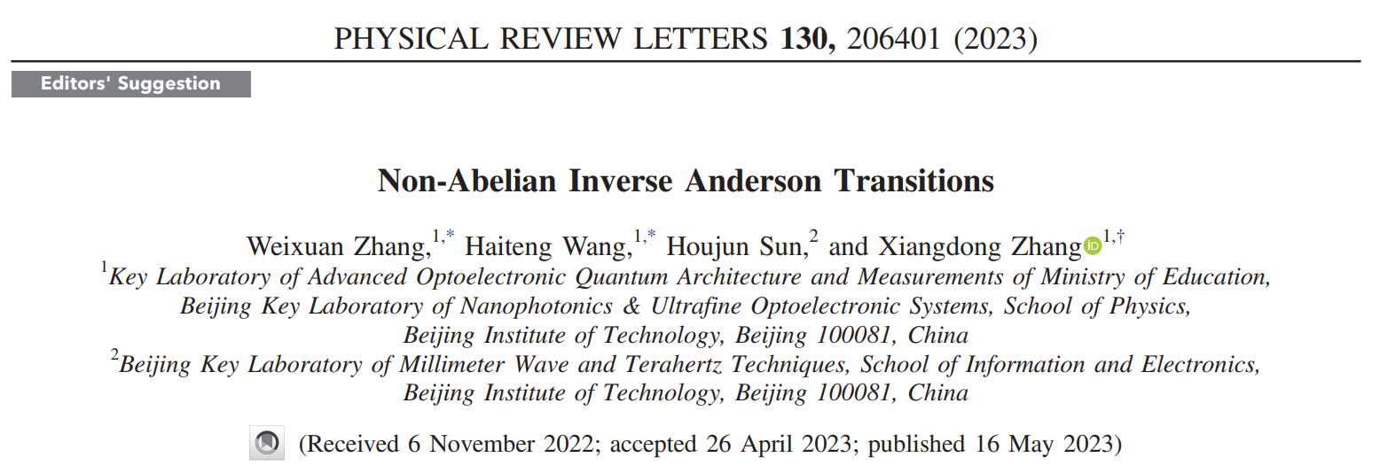 非阿贝尔规范场是杨振宁和罗伯特•米尔斯为了描述核子间相互作用而提出的。最近,人们将有效非阿贝尔规范场的概念推广到实空间和各种参数空间,揭示了众多具有非阿贝尔特性的新奇物理现象,如非阿贝尔AB效应,非阿贝尔拓扑态和非阿贝尔平带局域化等。因此,进一步探究逆安德森相变和非阿贝尔规范场的相互作用,揭示具有非阿贝尔特性的新奇无序物态,是具有重要意义的研究课题。另外,如何实验构造复杂的非阿贝尔无序系统,也是亟待解决的重要问题。