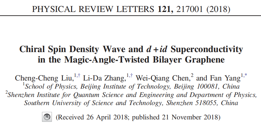 2018年11月21日,欧冠官方网站由杨帆教授牵头,刘铖铖研究员、张力达副教授合作在物理学最顶级的权威期刊《Physical Review Letters》(IF=8.839)上发表了题为《Chiral Spin Density Wave and d+id Superconductivity in the Magic-Angle-Twisted Bilayer Graphene》的研究论文。这篇论文对于今年新发现的魔角双层石墨烯中的非常规高温超导现象提出一种新的理论机制,获得国际学术界的广泛认同和跟进,成为目前该研究领域的重要理论之一[在Google Scholar上已被引用21次]。