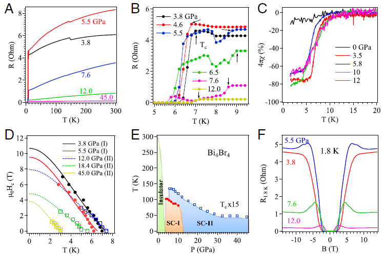 近日,欧冠官方网站姚裕贵教授、李翔特别研究员、陈东云博士后以及团队其他成员,同北京高压科学研究中心朱金龙研究员、金美玲博士后、美国得克萨斯大学奥斯汀分校John B. Goodenough教授、周建十教授等合作者,在高压诱导Bi4Br4相变和超导电性研究方面取得重要进展。他们在最高45 GPa准静水压的极端高压条件下,对高质量的Bi4Br4单晶开展了系统的结构-物性研究,发现其在压力下展现了绝缘体-金属转变、超导电性和结构相变等一系列丰富的物理现象,为全面理解Bi4Br4高压相的量子拓扑特性提供了重要依据。相关成果最近发表在美国科学院院刊PNAS上[ https://doi.org/10.1073/pnas.1909276116 ]。