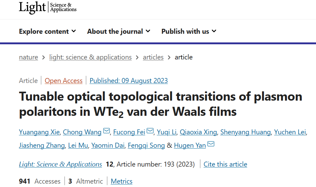 日前,欧冠官方网站姚裕贵教授团队王冲特别研究员与复旦大学物理系的晏湖根教授团队、南京大学欧冠官方网站宋凤麒教授团队合作,通过化学掺杂、温度手段对WTe2薄膜中等离激元的光学拓扑相变实现宽光谱范围调控,为可重构光子学器件的研究提供重要基础。相关研究题目为Tunable optical topological transitions of plasmon polaritons in WTe2 van der Waals films,成果被发表在光学顶级期刊《Light: Science & Applications》上(影响因子19.4)。