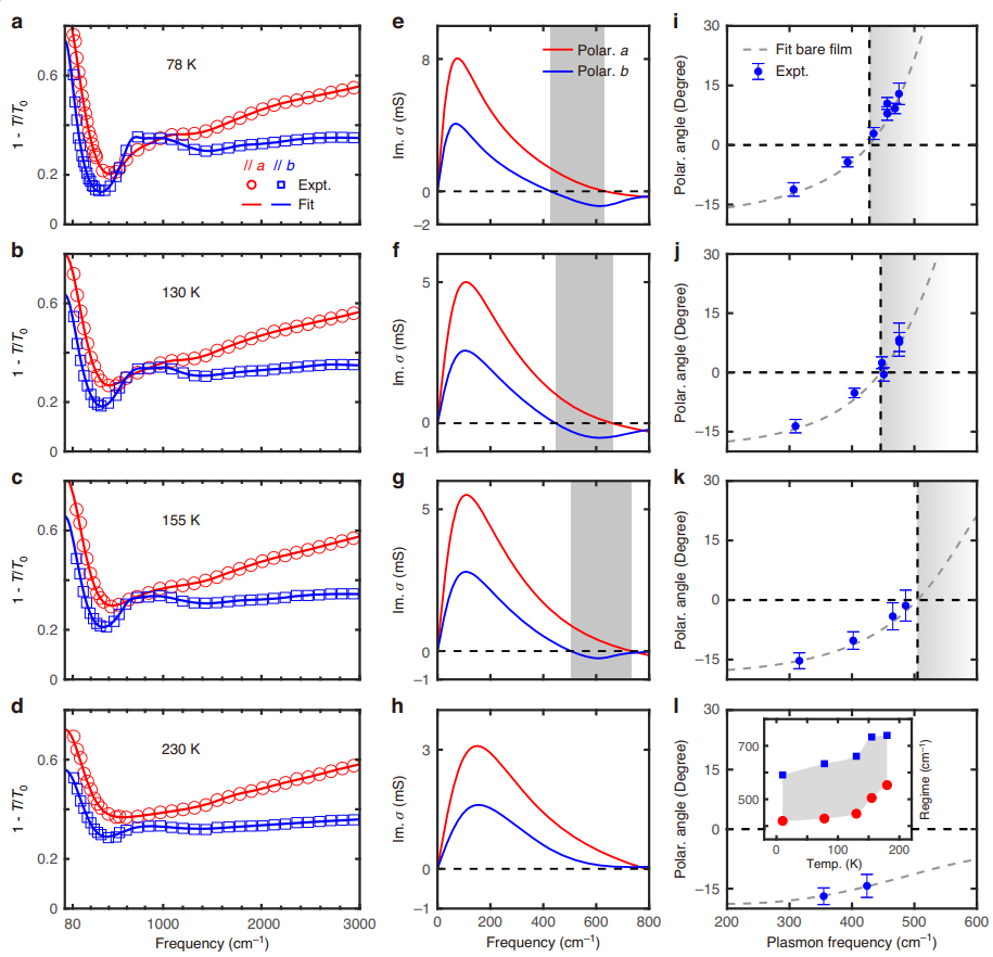图1,WTe2等离激元强度最大值偏振角度随能量变化。在椭圆区间(<460cm-1)为负值,双曲区间(>460cm-1)为正值。