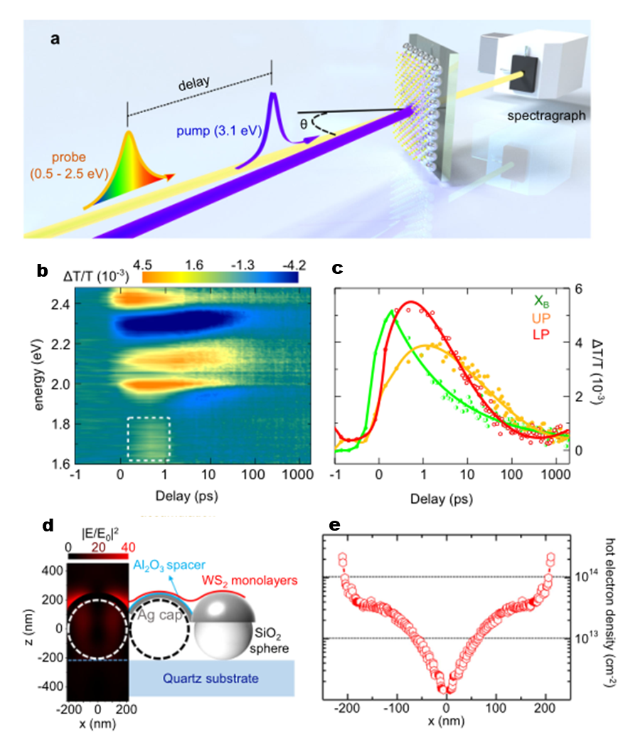 图1. (a)实验装置图。(b)由表面等离激元和二维半导体组成复合体系的瞬态吸收谱。由于强耦合效应,二硫化钨原本位于2.1eV处的吸收峰劈裂为两个吸收饱和峰。带隙重整化导致了在1.6 eV处出现了新的光学增益峰。(c)体系中激子和极化子的衰减曲线。(c)和(d)结构中的场增强分布和热电子浓度的空间分布图。
