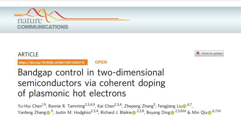 日前,欧冠官方网站张向东教授课题组青年教师陈宇辉研究员与新西兰维多利亚惠灵顿大学、奥塔哥大学,以及北京大学和西湖大学的研究者开展合作,在表面等离子体光学腔和二维半导体二硫化钨的复合体系上,通过利用光和物质强耦合效应,在实验上实现了对二硫化钨的高效热电子掺杂,大幅改变了二硫化钨原有的带隙,相关研究成果发表在国际顶级期刊《自然·通讯》上。