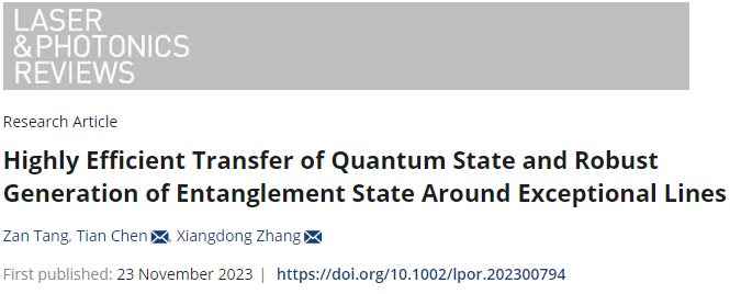 近日,欧冠官方网站张向东教授课题组设计非厄米量子行走,实现了高效量子态拓扑调控。相关成果以“Highly Efficient Transfer of Quantum State and Robust Generation of Entanglement State Around Exceptional Lines”为题发表在Laser & Photonics Reviews 期刊[Laser Photonics Rev. 2023, 2300794]上。该研究工作得到了国家自然科学基金委的大力支持。欧冠官方网站汤赞博士、陈天副教授为该论文的共同第一作者,欧冠官方网站陈天副教授、张向东教授为论文共同通讯作者。