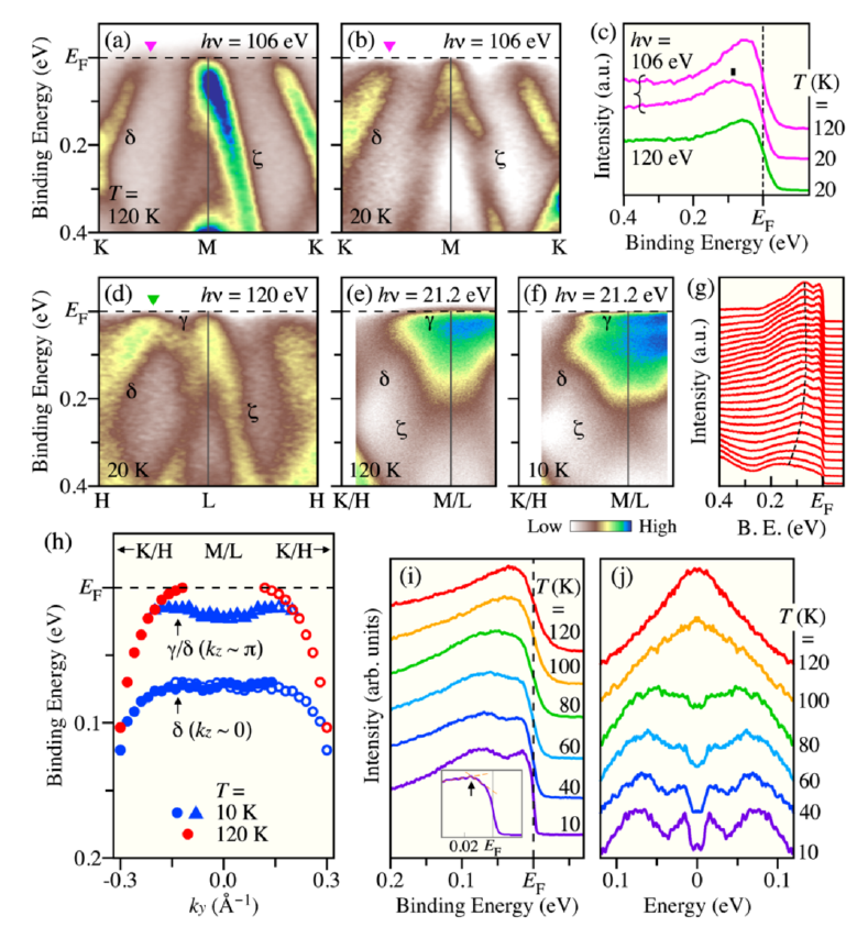 首先在CsV3Sb5母相材料中观察到了鞍点和狄拉克点,如图7所示。进一步,当体系温度降至CDW转变温度以下时,观察到CDW能隙,而且该能隙有很强的费米面和动量依赖特性,如图8所示。相关结果以Letter的形式发表在PRB上[Phys. Rev. B 104, L161112 (2021)]。更进一步,通过在CsV3Sb5材料表面进行原位Cs原子沉积,首次实现了体系的电子掺杂,并由此操控体系的CDW及能带。Cs沉积对该材料的电子掺杂具有轨道选择性,其特征是Sb 5pz和V 3dxz/yz能带的电子填充显著增加,而V 3dxy/x2−y2能带则相对稳定。通过研究M点周围CDW能隙随温度的变化关系,发现Cs修饰可以完全抑制CDW,同时使鞍点保持在费米能级,如图9所示。该结果表明,多轨道效应对CDW的产生起着至关重要的作用,同时由于CDW和超导之间的竞争,这为未来在AV3Sb5体系中操纵CDW和超导电性提供了可能。相关结果发表在PRX上[Phys. Rev. X 12, 011001 (2022)]。