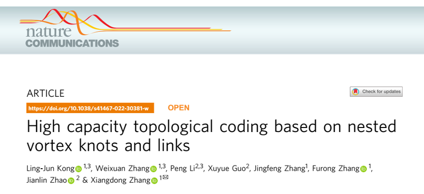 日前,欧冠官方网站张向东教授课题组和西北工业大学物理科学与技术学院的赵建林教授课题组合作,在基于嵌套纽结结构高容量拓扑编码研究方面取得重要进展。相关研究成果发表在近期的Nature Communications上,研究工作得到了国家自然科学基金委和国家重点研发计划的资助。