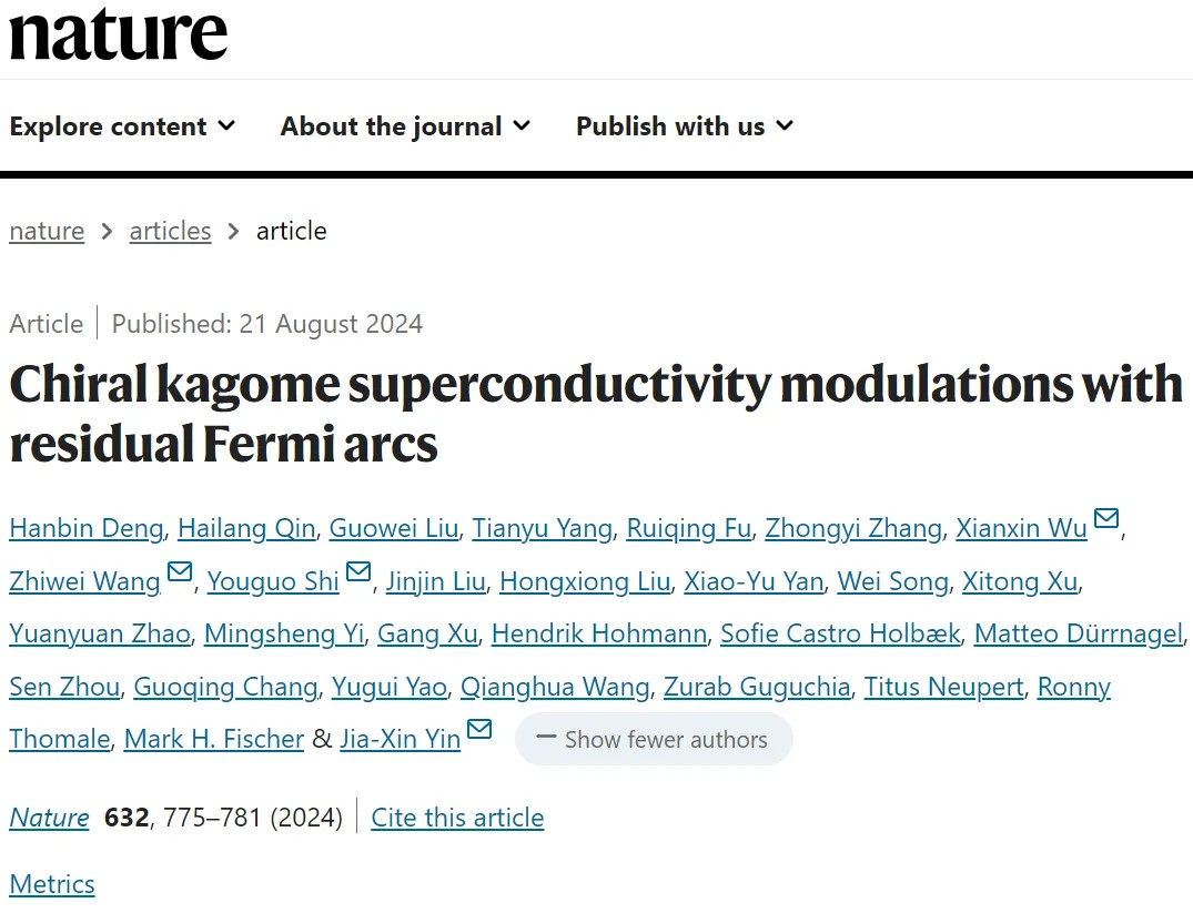 近日,欧冠官方网站王秩伟、姚裕贵教授团队,与南方科技大学殷嘉鑫团队、中科院理论物理所吴贤新团队、中科院物理所石友国团队等人合作,在笼目晶格超导材料AV3Sb5(A = K, Rb, Sb)中发现量子可调的磁性超导态,这种超导态具有手性超导能隙振荡的特征,显示笼目超导材料是探索磁性超导的重要材料体系,相关成果以“Chiral kagome superconductivity modulations with residual Fermi arcs”为题发表在Nature, 632 (2024) 775。
