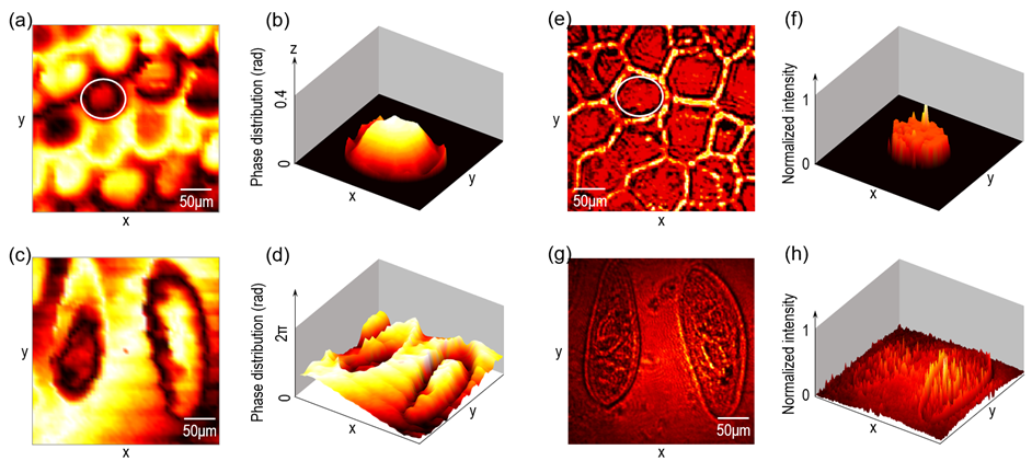 为了进行比较,该团队使用普通振幅显微镜对番茄和草履虫生物样品进行成像(如图4e和图4g所示),图4f和图4h提供了相应的单细胞图像。可以发现,从这些图像中获得的细胞内分布类似于随机噪声,虽然可以获得每个细胞的边缘信息,但无法提取任何有用的信息。事实上,细胞内物质分布的信息对于研究细胞内物质的分布和相对流动具有极其重要的意义。通过QHM所获得的图像,可以用于计算细胞体积、折射率、干质量、细胞形状等细胞参数。这些参数目前是其他量子相位显微成像方案所无法实现的。